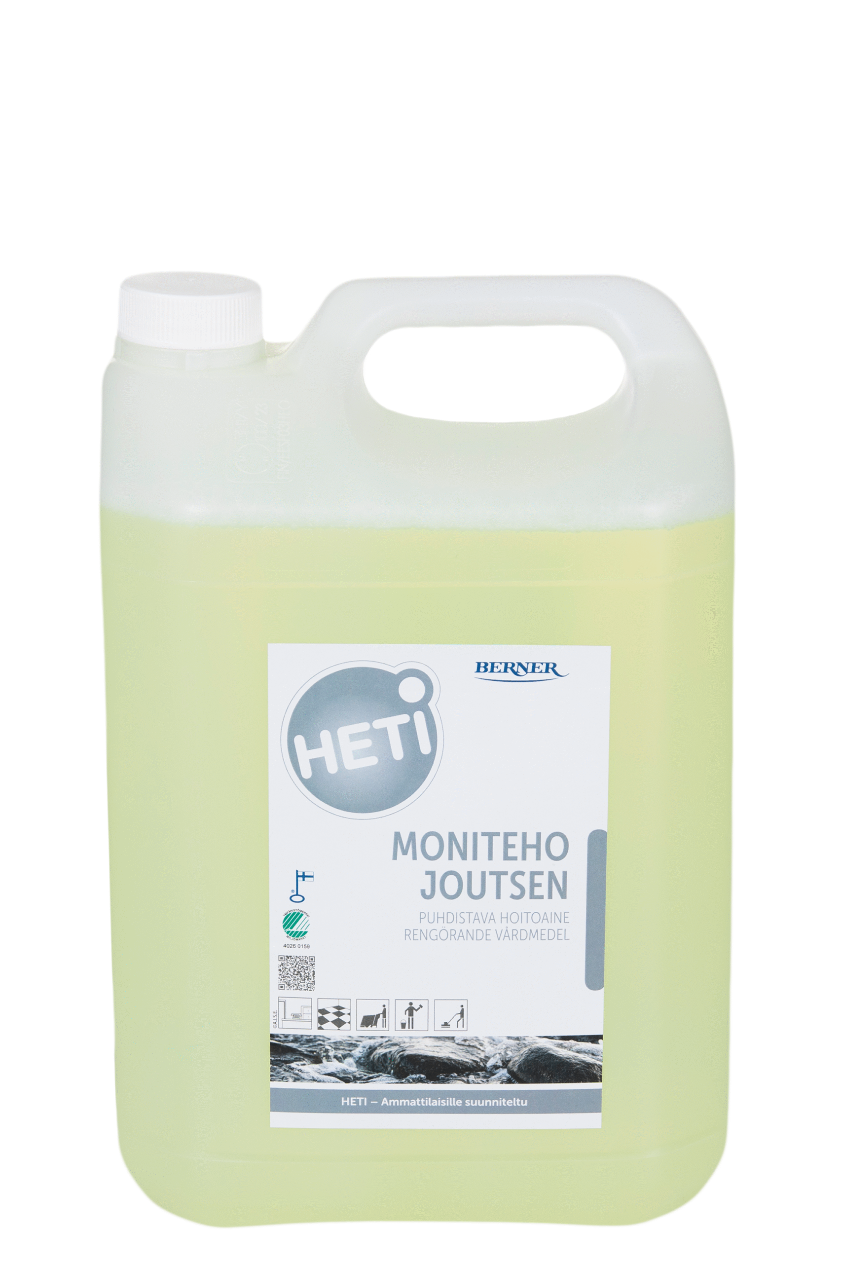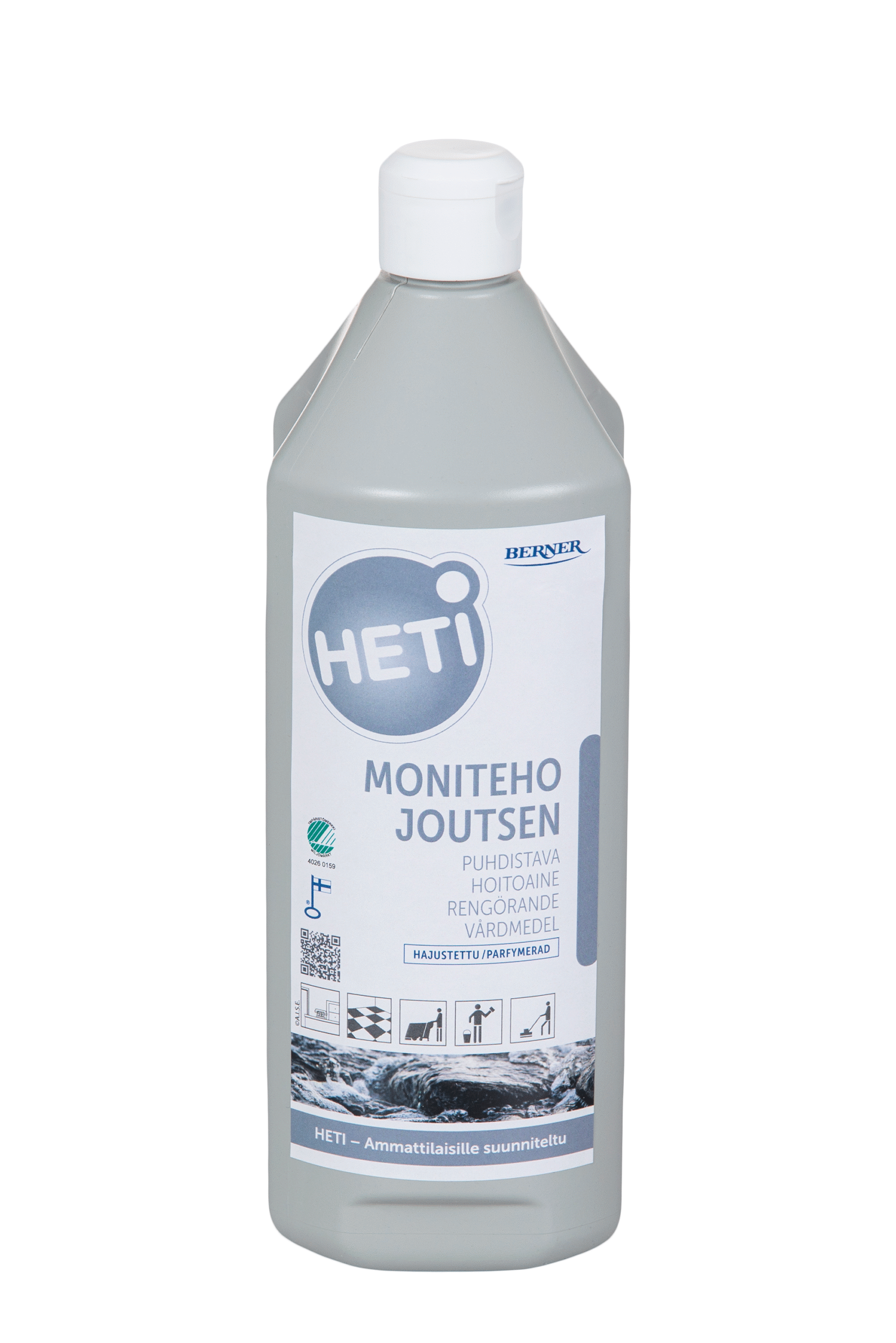 HETI Moniteho Joutsen sopii kaikkien kovien pintojen puhdistus- ja hoitoaineeksi ylläpitosiivoukseen myös käsi- että konemenetelmiin. Tuote on hajustettu ja sillä on Joutsenmerkki.