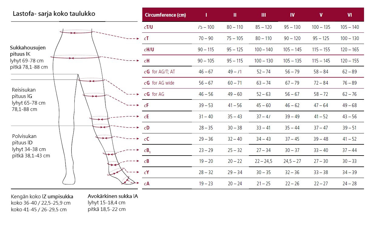 Sukasta on saatavilla kuusi eri kokoa sekä kahta eri pituutta ja jalkaterän pituutta. Oikean koon määrittämiseksi tarvitaan ympärysmitat kokotaulukon mukaisista kohdista. Sukan pituus mitataan päättyväksi sääriluun kyhmyn korkeudelle tai noin kaksi sormea polvitaipeen alapuolelle. Jalkaterän pituus on mitta kantapäästä varpaiden tyveen. Mitta tulisi ottaa seisten, jalka lattiaa vasten jalkaterän sisäsyrjältä.