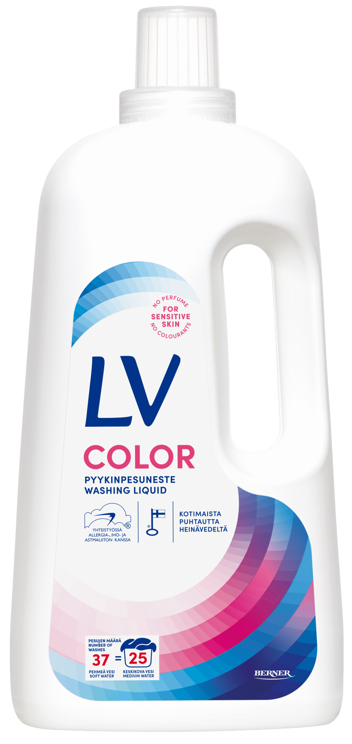 Hajusteeton ja väriaineeton LV Color Pyykinpesuneste on nestemäinen pyykinpesuaine kirjopyykille, joka puhdistaa tekstiilit tehokkaasti ollen samalla hellävarainen. LV Color Pyykinpesunesteellä on Allergia-, iho- ja astmaliiton tunnus.